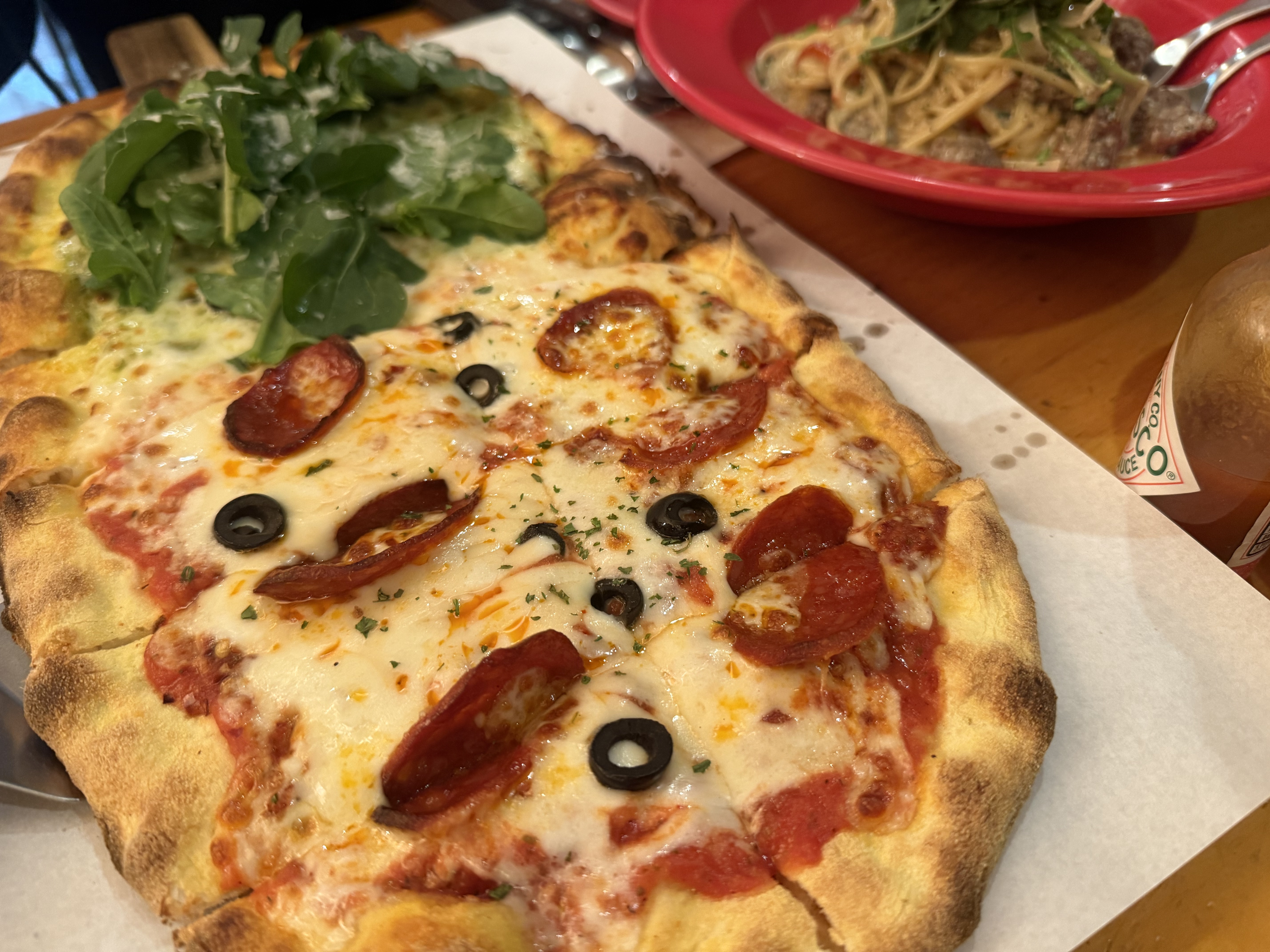 우리는 루꼴라 피자와 초리조 디아볼라 피자를 반반으로 주문했어.