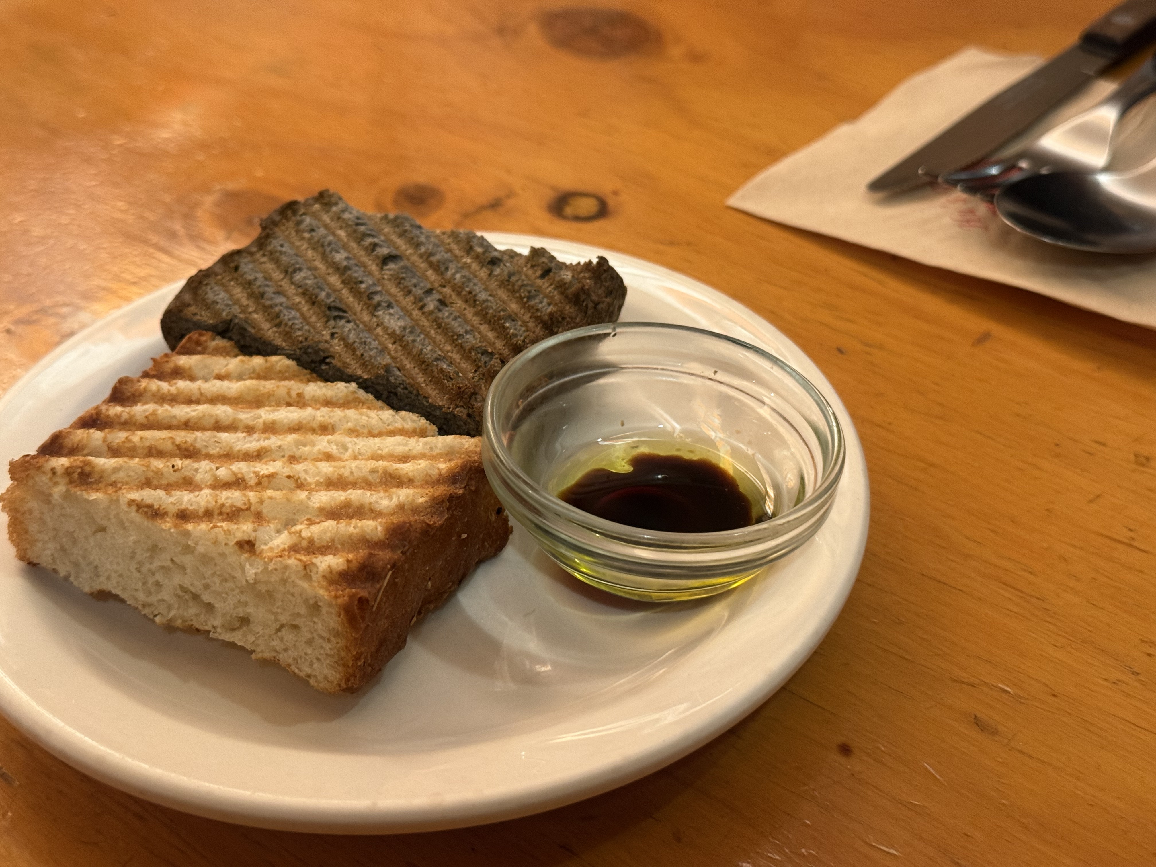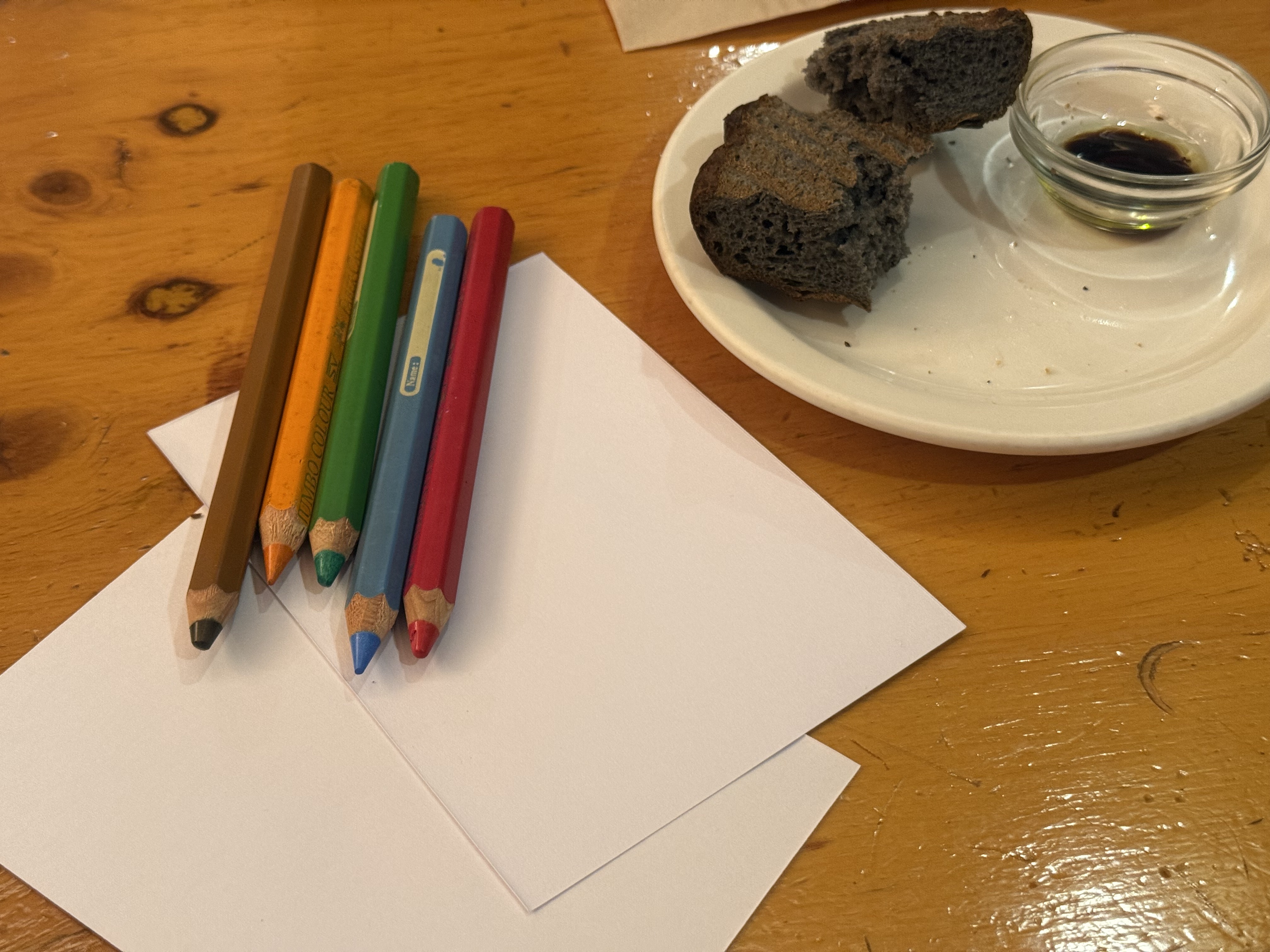 따뜻한 식전 빵과 함께 테이블 위에 있는 색연필과 엽서가 눈에 띄었어.