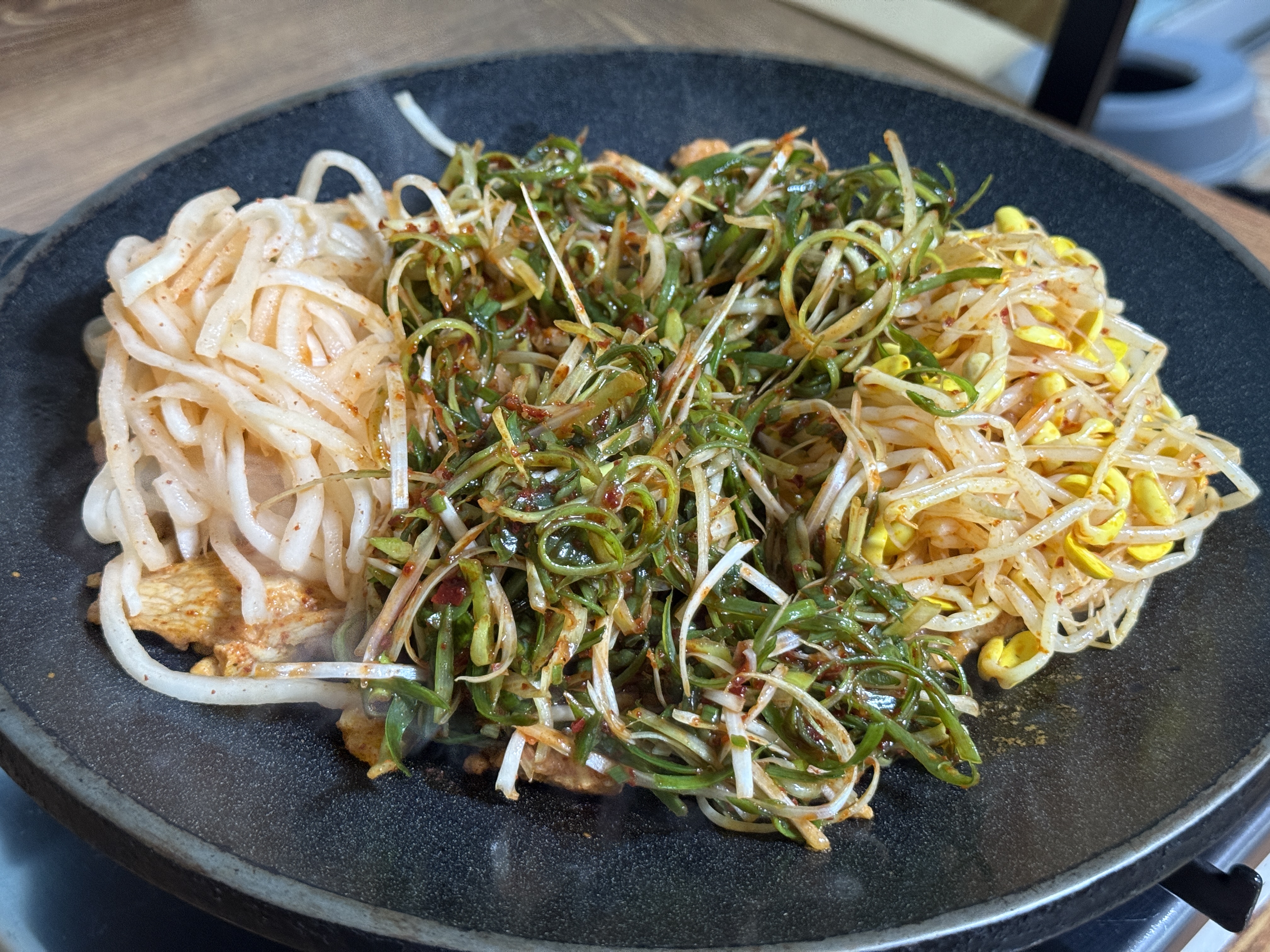이를 테이블에 비치된 무쇠판에 올려 직접 양념하여 볶아 먹습니다.